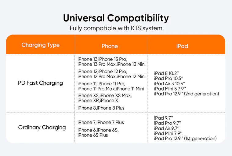 – iPhone 8 or later models support fast charging, previous models only support normal charging.