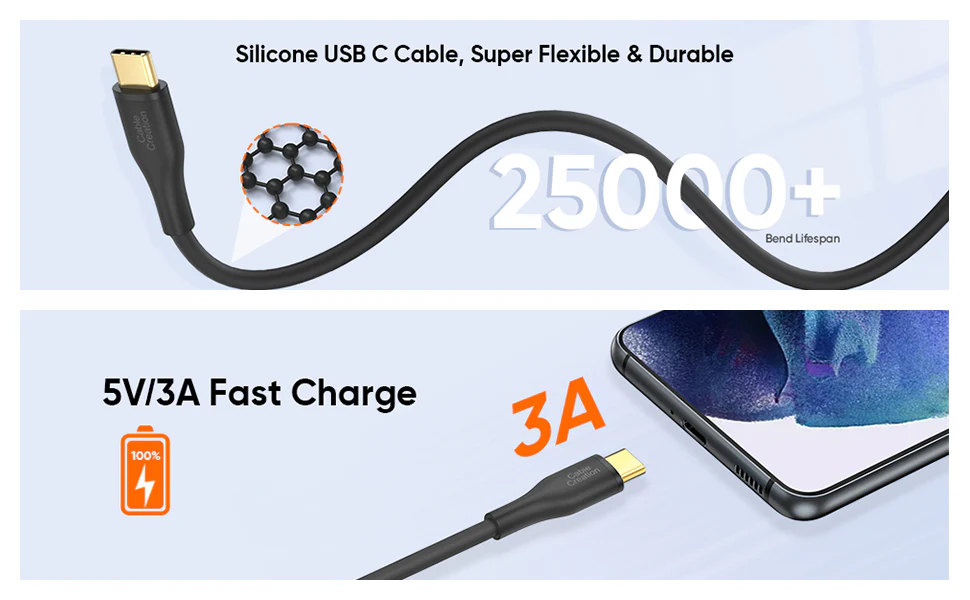 Reinforced strain relief design provides the usb c charger cable with long service life and more durability. Can withstand over 25000 bending test. Flexible silicone material prevents the cable from knotting and tangling