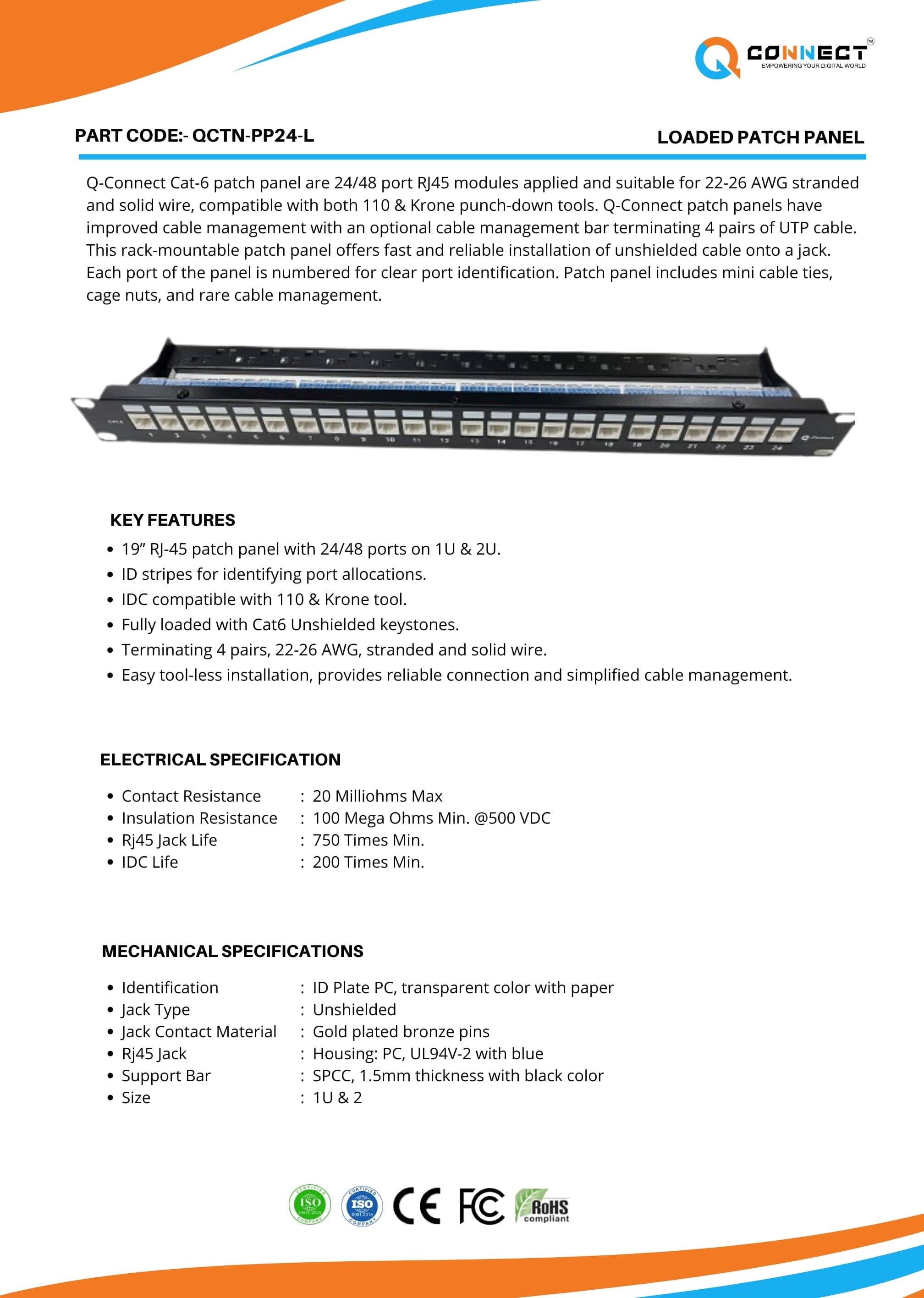 Introducing the Q Connect Loaded Patch Panel, a comprehensive and efficient solution designed to streamline and organize your network connections with precision and reliability. Perfect for data centers, telecommunications facilities, and office environments, our loaded patch panels offer a plug-and-play experience, ensuring your network infrastructure is both robust and easy to manage.