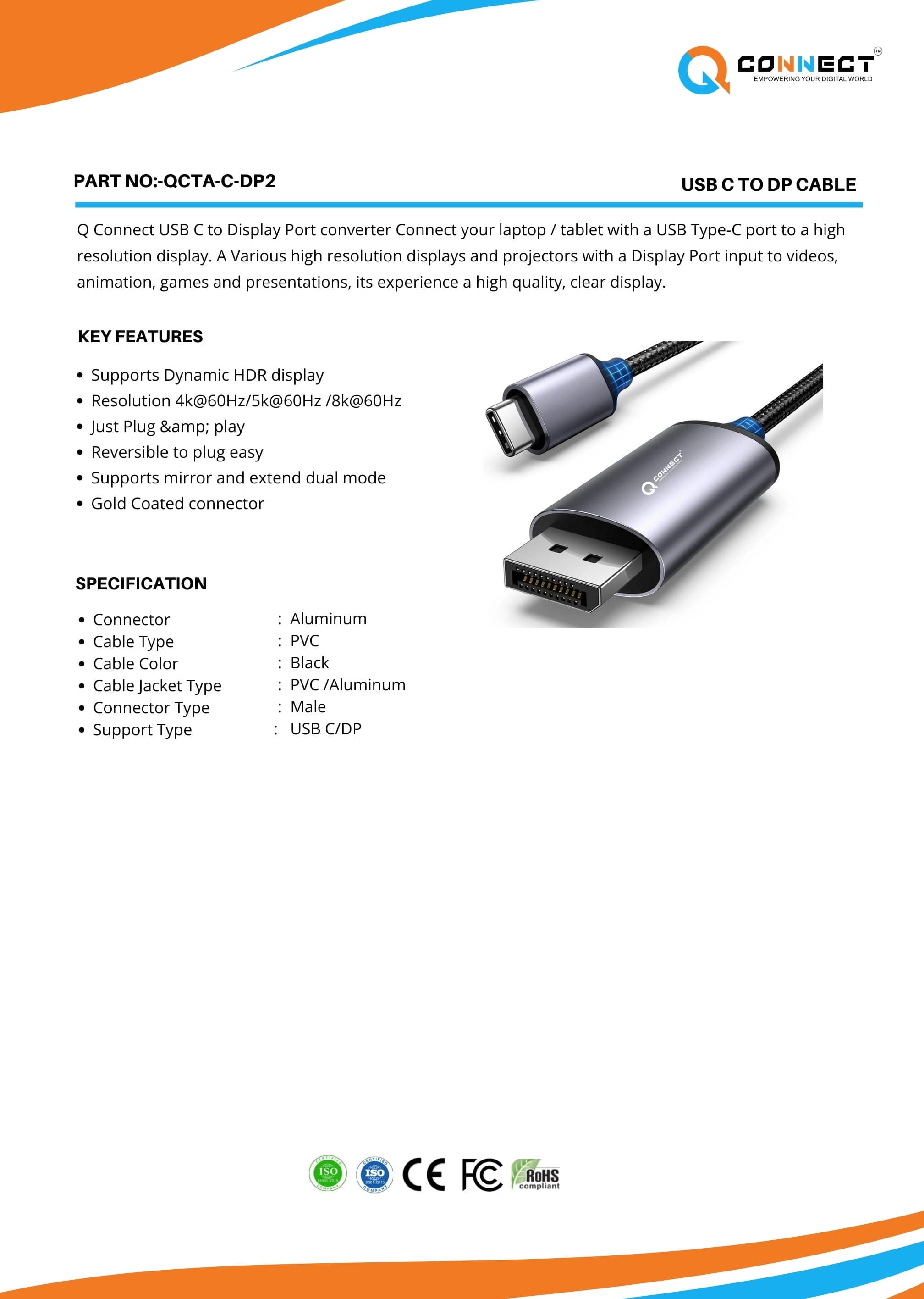 Introducing the Q Connect USB-C to DisplayPort (DP) Cable, a versatile and high-performance solution designed to deliver superior video and audio connectivity for modern devices. This cable provides seamless compatibility and reliable performance, making it an essential accessory for professionals, gamers, and enthusiasts seeking to maximize their display capabilities.